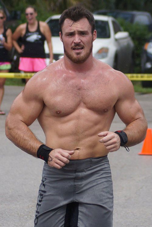 Running around with his sweaty, hairy pecs.