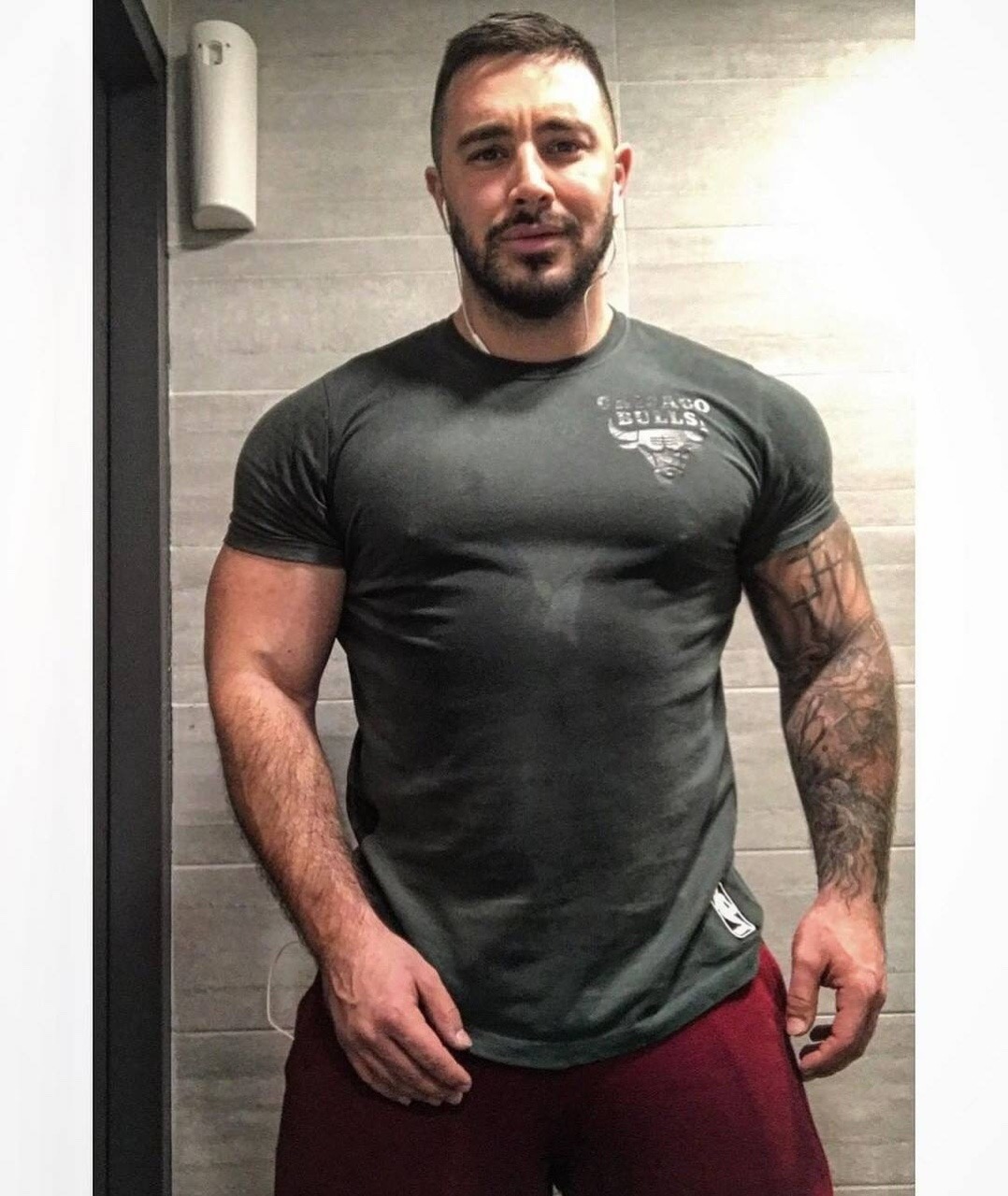 Sweaty and hairy pecs.