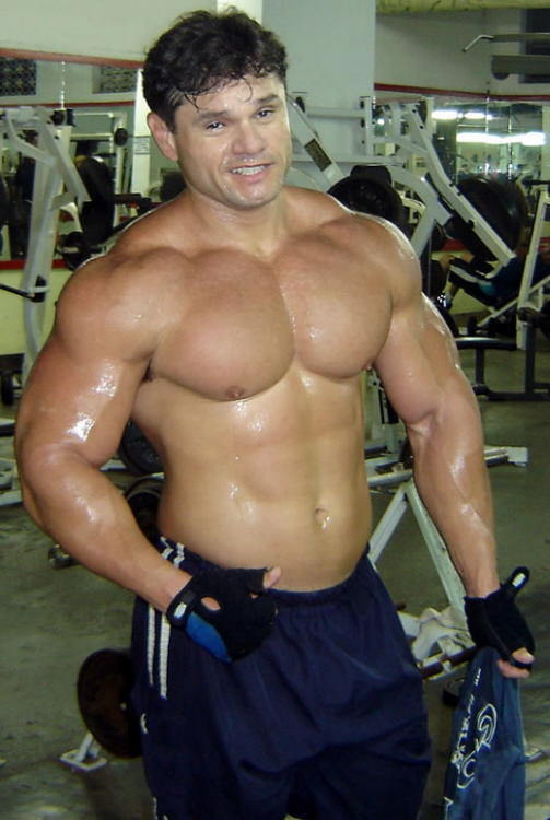 Showing off his lean, sweaty pecs at the gym.