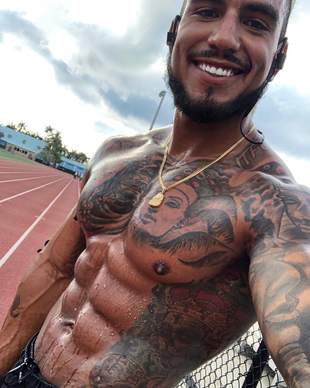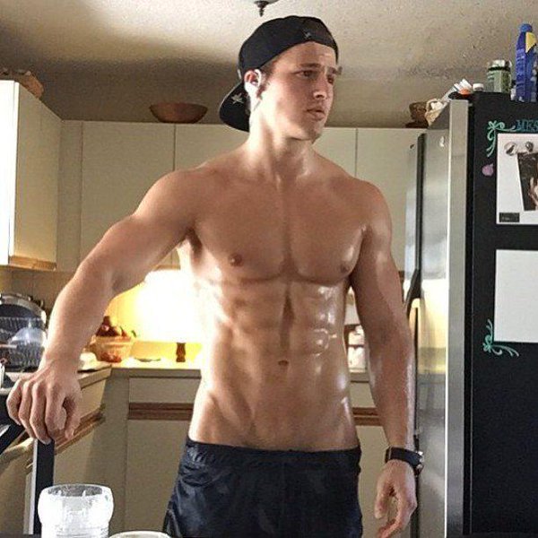 Lean, sweaty pecs and abs