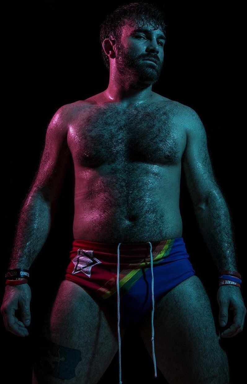 Showing off his meaty, sweaty pecs.