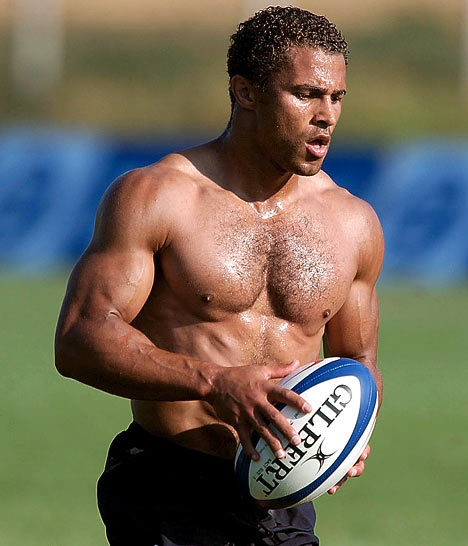 Hard, hairy, sweaty pecs on the rugby field.