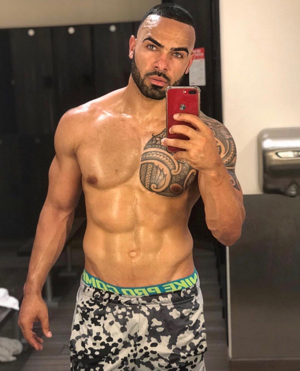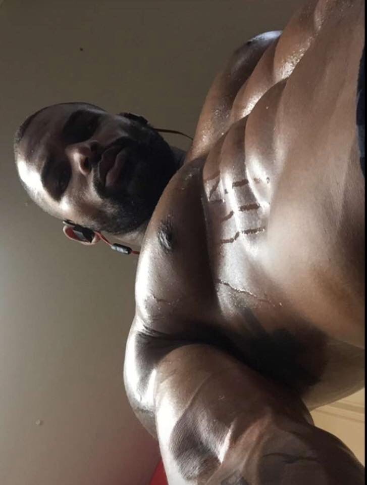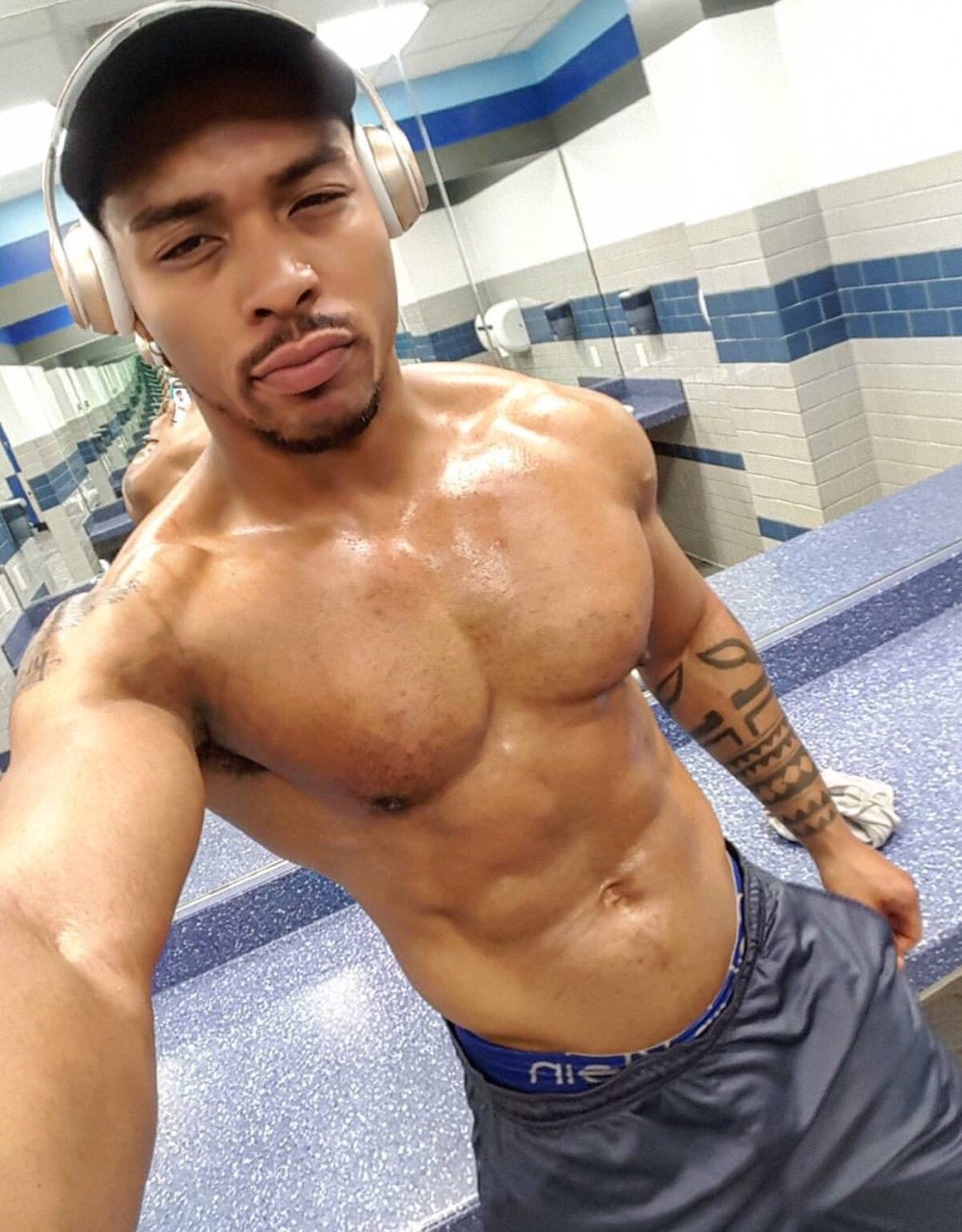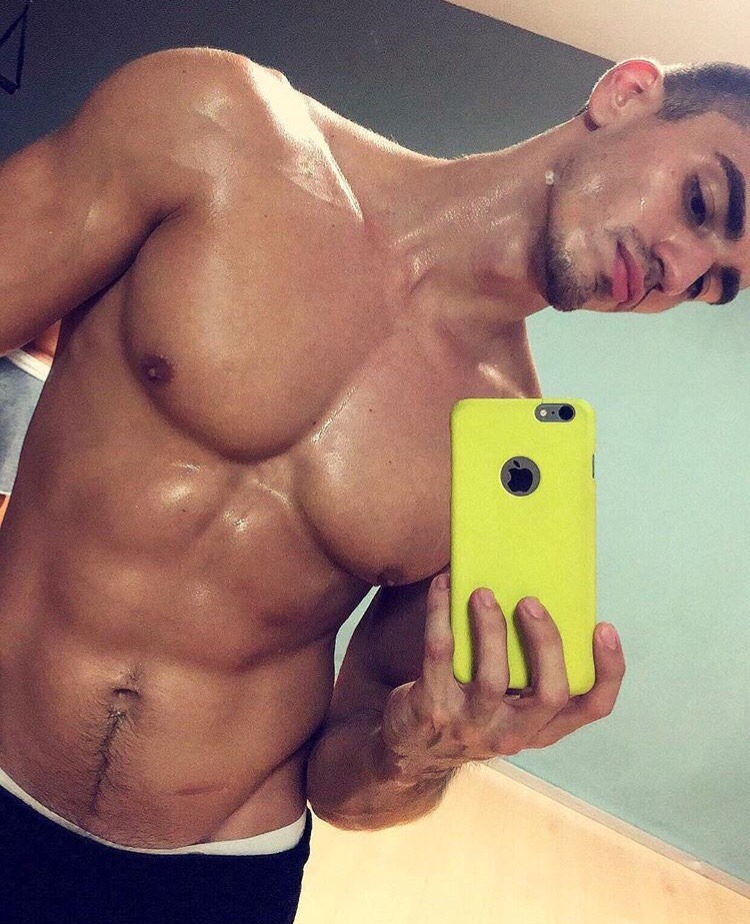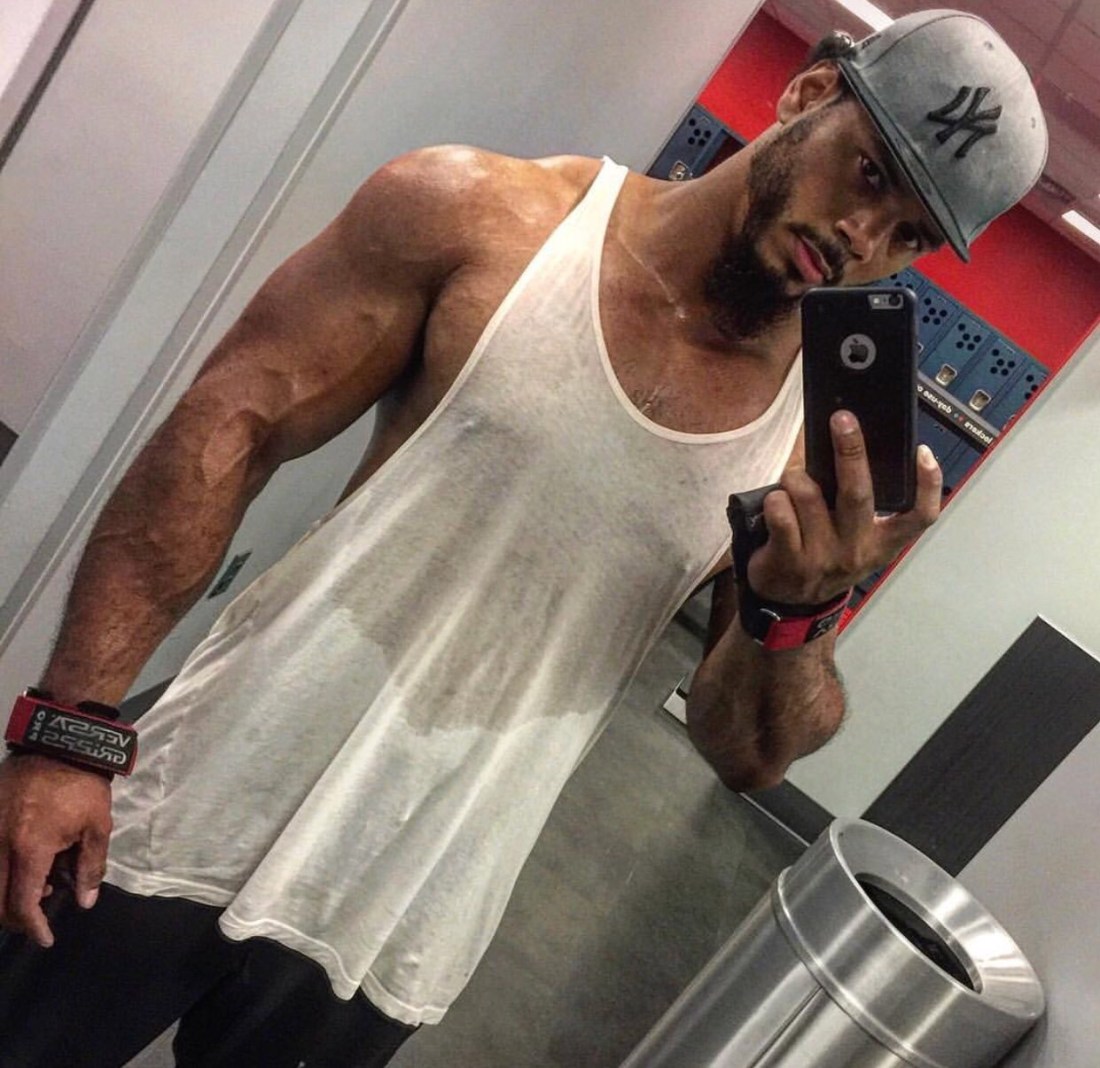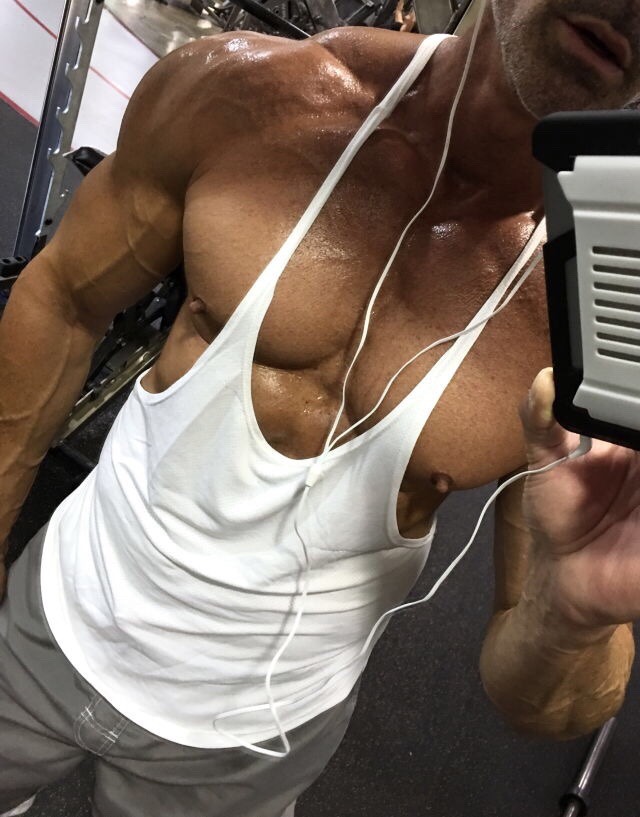 This is one of my favorite gym selfies. I’m such a fucking muscle slut, showing off my muscle tits in this stringer. I’m all pumped and sweaty, my nips standing at attention. I love being an exhibitionist. That’s what muscle is for.